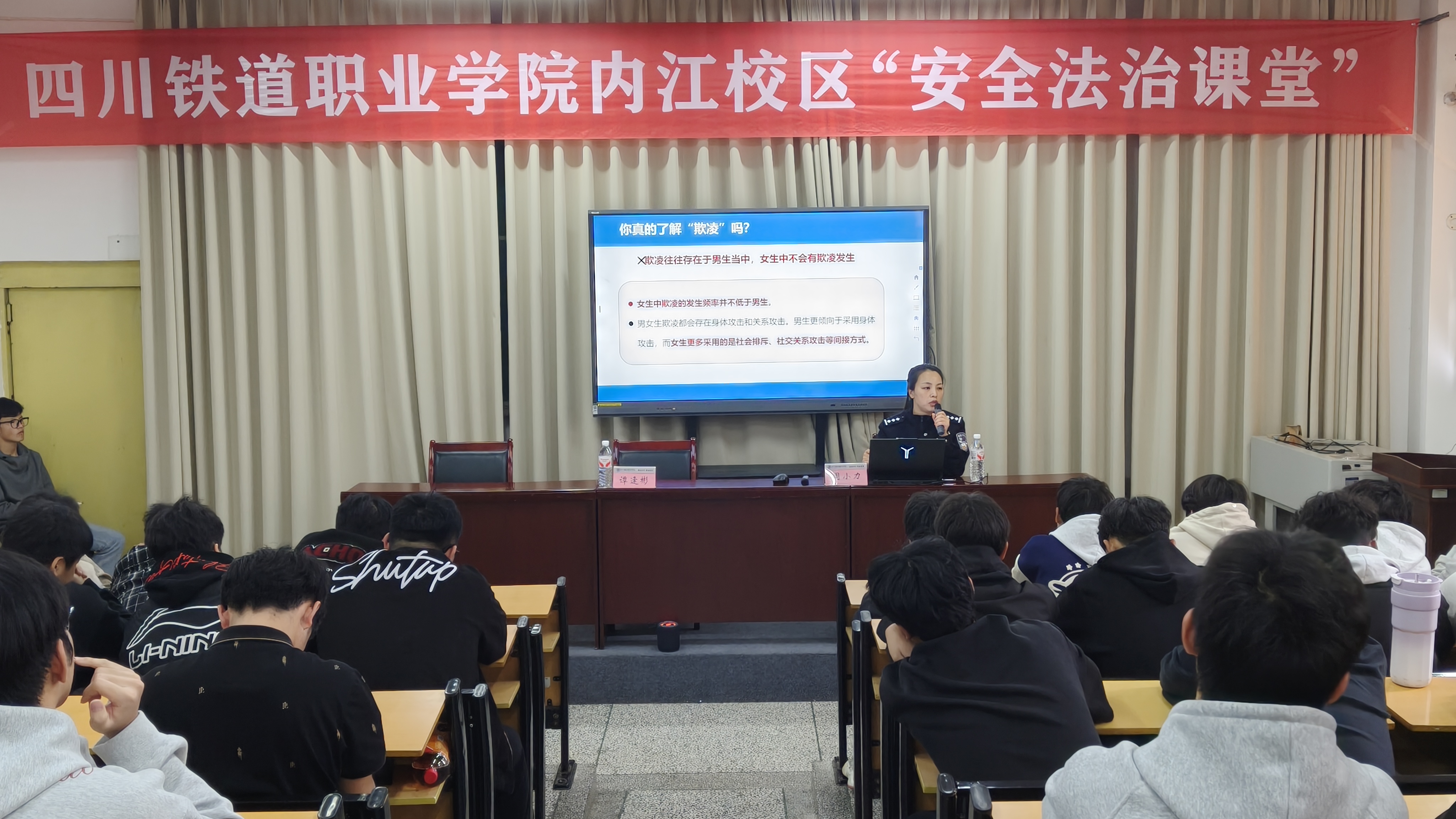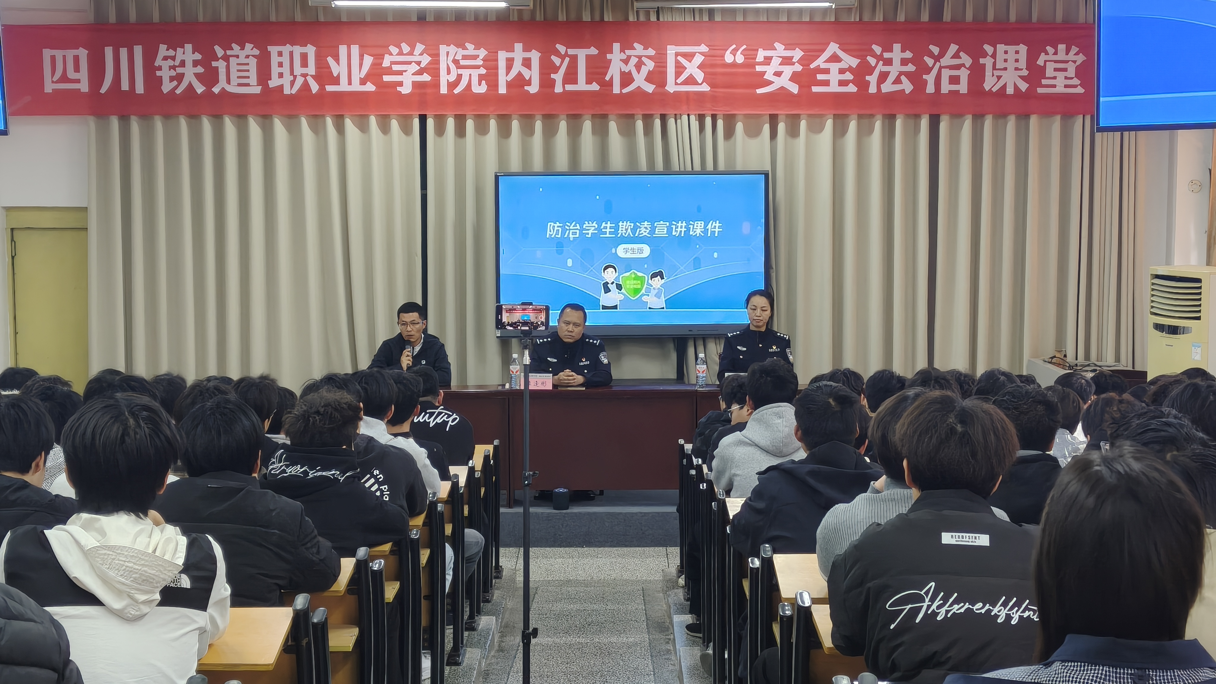 为进一步提升学生的法治意识和安全防范能力,营造安全、和谐的校园环境。3月30日下午,内江校区管委会邀请内江交通派出所谭逢彬副所长、周小力警官走进校园,为学生们讲授了一堂生动的安全法治课堂。内江校区管委会副主任尹菊英,分团委书记、学生科科长李文参加。