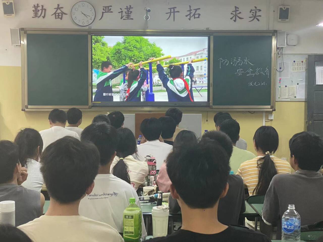班会上,各班班主任组织全体学生观看防溺水警示教育片,利用多媒体一体机播放PPT、图片、列举了近年来溺水事件等向全体学生防溺水教育的重要性、溺水的危害、如何预防溺水。同时,强调了要防溺水牢记“六不要求” ,节假日外出游玩安全注意事项等,各班要求全体学生要时刻保持警觉,同学之间相互加强监督,相互提醒,提高防溺水安全意识。