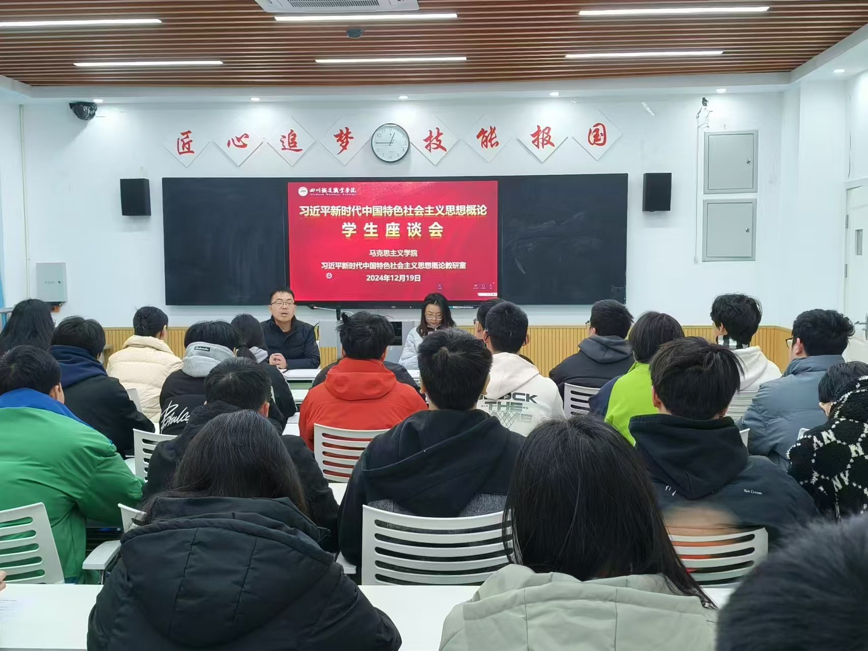 为贯彻落实习近平总书记关于办好高校思政课的重要讲话精神,落实立德树人根本任务,全面了解各专业学生对《习近平新时代中国特色社会主义思想概论》课程教育教学的意见和建议,进一步提升教学效果。12月19日中午,习近平新时代中国特色社会主义思想概论教研室(以下简称“教研室”)在1209教室召开学生座谈会,本学期开设习近平新时代中国特色社会主义思想概论课程的各班学生代表及教师代表40余人参加。会议由马克思主义副院长、教研室主任严涛主持。