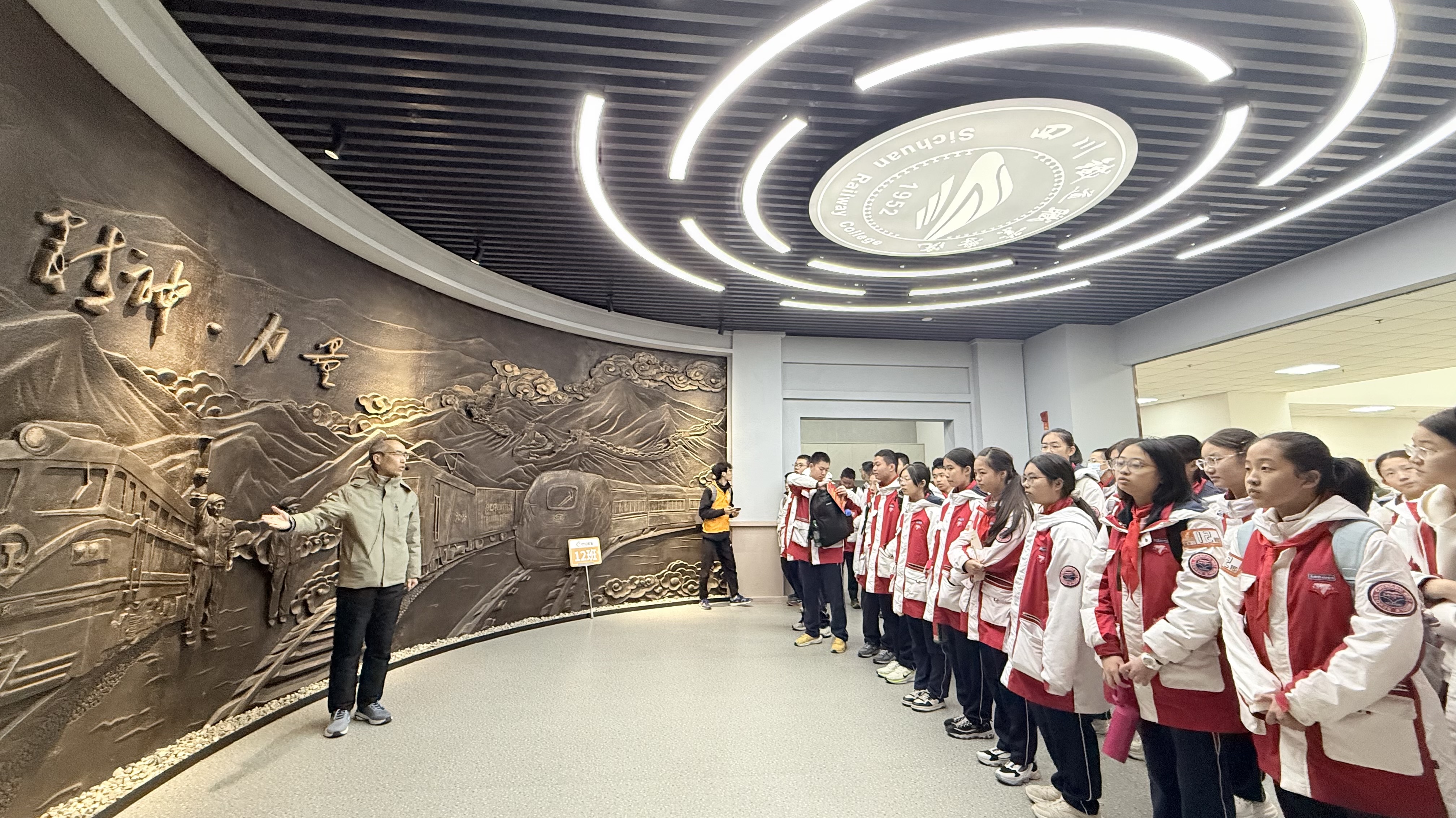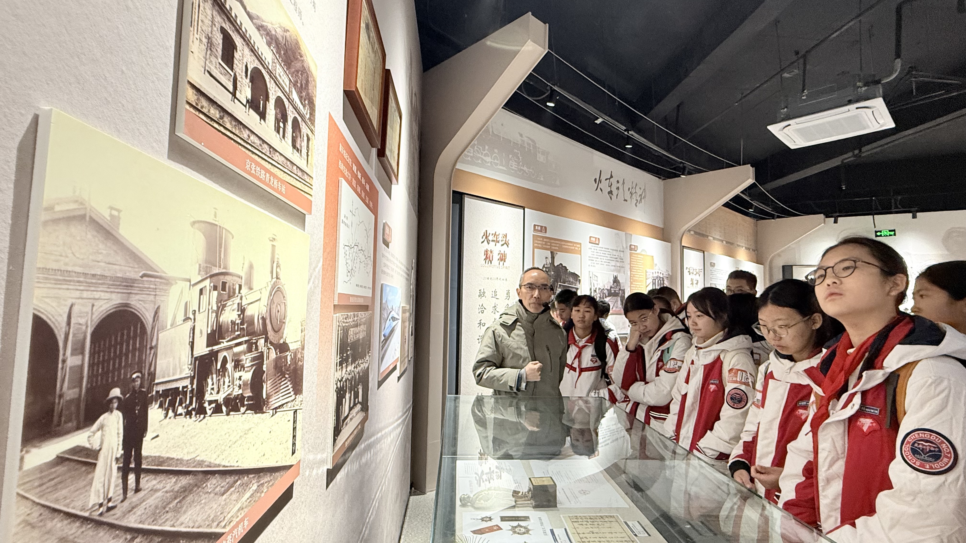 在铁道精神博物馆序厅“精神·力量”大型浮雕前,讲解员通过“愚公移山”“夸父追日”等神话故事的精神内核,讲述铁道精神产生的文化背景。通过铁路四代机车的发展变迁,讲解铁道精神的形成与中国铁路的伟大成就,激发同学们对铁路事业的兴趣和民族自豪感。