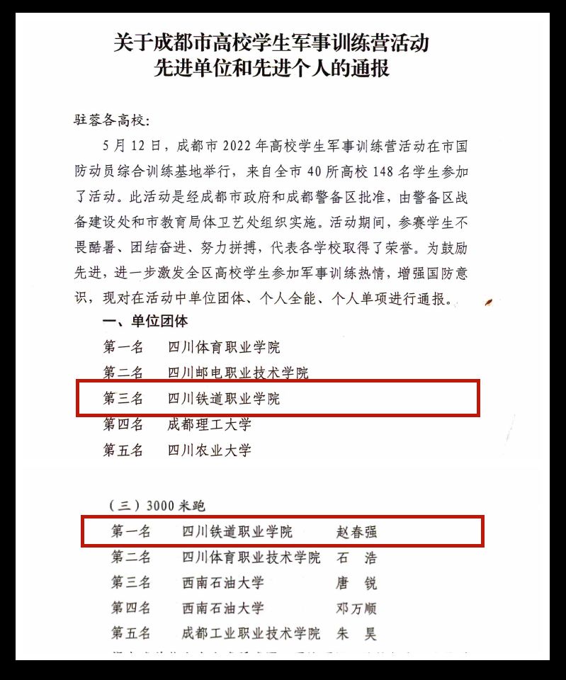 近日,成都市国防动员委员会表彰了2022年高校学生军事训练营活动的参赛单位及个人,beat365官网荣获单位团体第三名,赵春强同学荣获3000米跑第一名。