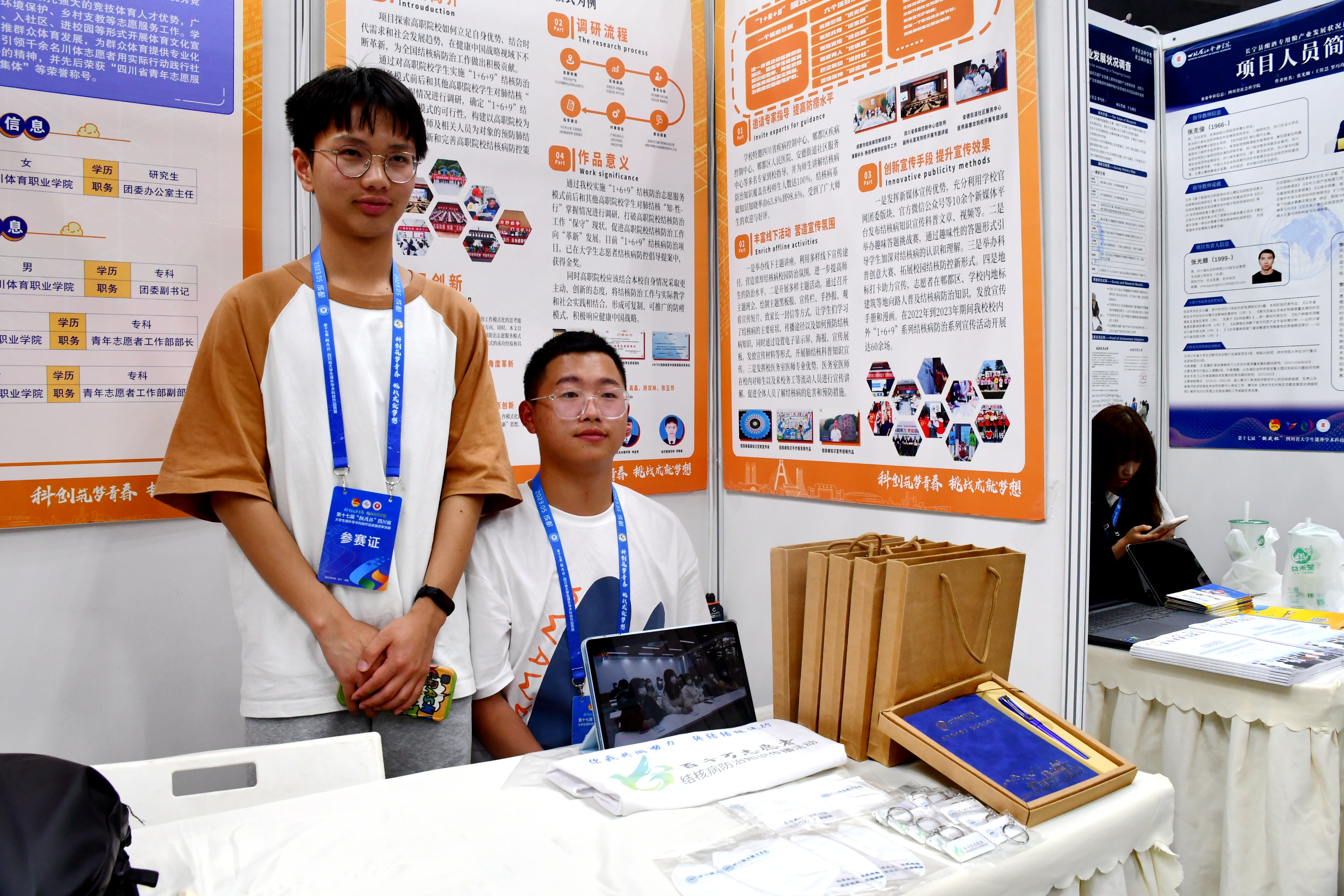 beat365官网钟金焘、李鑫、李陈睿等同学的团队作品《从“一”到“众”健康中国视域下高职院校结核防治 从“保守”到“革新”的调研--以1+6+9防治模式为例设计》进入本次“挑战杯”终审决赛。由团委书记朱俐老师领队,学生处唐恬老师、辅导员刘小杨老师共同带队前往成都大学进行现场路演与展示。整个项目展演期间,该作品备受瞩目,以1+6+9防治结核志愿服务为案例,将结核防治工作与实际教学和社会实践相结合,形成可复制、可推广的模式,受到了诸多高校老师、同学的咨询与探讨,也受到了评委专家的驻足常看和兴趣。