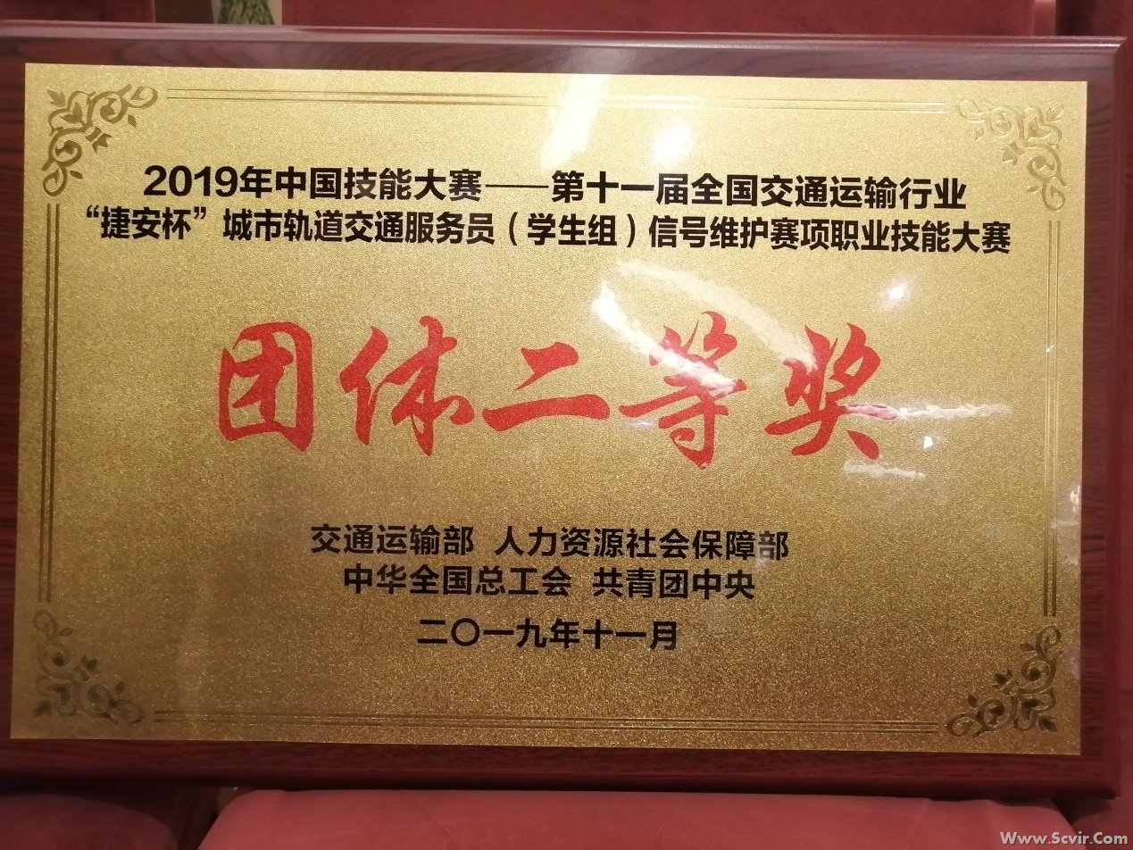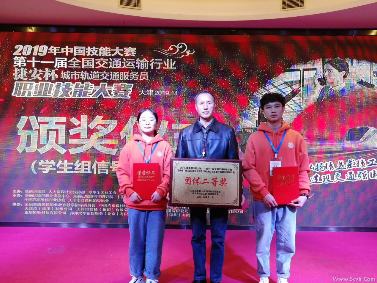 2019年11月19日至21日, 2019年中国技能大赛——第十一届全国交通运输行业“捷安杯”职业技能大赛在天津梅江会展中心举行。我院学生组信号维护赛项代表队经过前期的四川预赛、重庆拉练赛,最终进入了全国总决赛,与来自全国36所职业院校的代表队进行激烈角逐。经过两天的激烈比赛,我院代表队获得了团体二等奖的好成绩。电信工程系曾佳美、毛启章两位同学获得学生组二等奖,杜中彦、聂富春老师获优秀指导教师奖。杜中彦老师受邀作为此次大赛的裁判,获得了优秀裁判员称号。