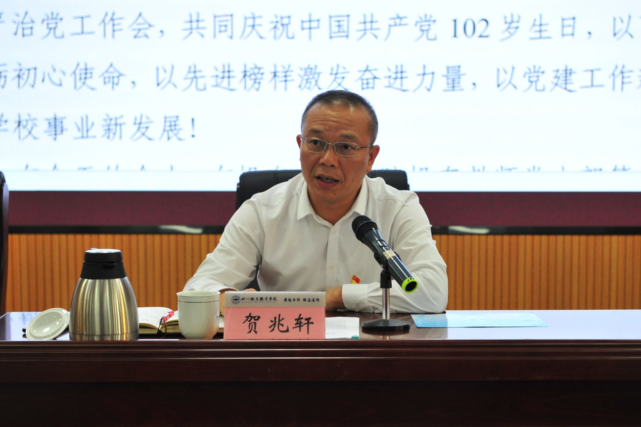 贺兆轩强调,要坚持示范引领以上率下,推动党建工作上新水平。党的各级组织体系要协同联动、共同发力,全体党员、干部要坚持做到示范引领、以上率下。学校党委要坚持以政治建设为统领,扛牢管党治党、办学治校主体责任;各级党组织要以提升组织力为重点,更好团结党员、干部职工扎实推动党建与业务深度融合,助力学校改革发展;中层干部要着力增强政治能力,提高履职担当本领;全体党员要增强党性修养,发挥模范带头作用。 贺兆轩指出,要始终聚焦高质量主题和问题导向,纵深推进全面从严治党。要提高政治站位,为开展学习贯彻习近平新时代中国特色社会主义思想主题教育做好思想和工作准备;要抓实抓牢年度党建重点任务,着力打造校级“铁肩担道”党建工作品牌、开展第二批党建“双创”和持续加强大学生思想政治教育和意识形态工作;要坚持正确选人用人导向,建设高素质专业化干部队伍;要持之以恒巩固风清气正校园政治生态。 最后,贺兆轩号召全体党员干部要紧密团结在以习近平同志为核心的党中央周围,深入学习贯彻党的二十大及历次全会精神、省第十二次党代会及二次、三次全会精神,全面推进学校第一次党代会任务目标,以先进模范为榜样,校准思想之“标”、绷紧作风之弦,拉满行动之弓,继续“抢时间、拼一流、抓落实”,为加快推进学校一流高职院校建设再创佳绩、再立新功。