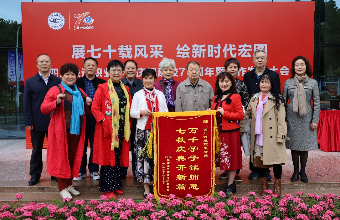 中师语文1班返校校友还代表班级全体同学,向母校赠送了“七秩庆典开新篇 万千学子铭师恩”的锦旗。