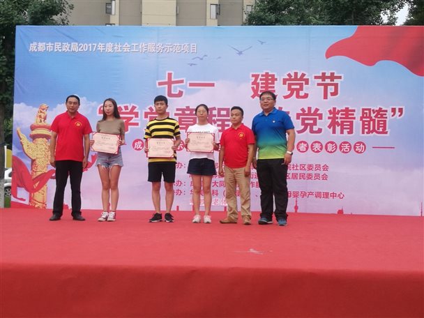 2018年6月29日,我院“青马社”成员孙于涵、苟岚涵、徐俊才受郫筒街道书院社区居委会的邀请,参加书院社区主办的七一建党节“学党章程 传党精髓”成都市示范项目暨志愿者表彰活动。