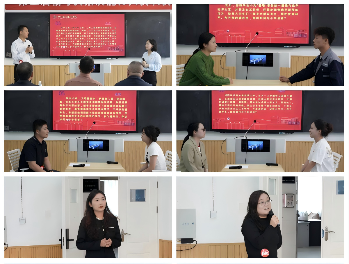 决赛聚焦辅导员工作实际,设置案例研讨与谈心谈话两大环节。案例研讨中,参赛辅导员围绕学生思想引导、学业发展、心理关怀、生涯规划等典型工作场景,层层拆解问题根源,提出针对性强、可操作性高的解决方案,展现了丰富的实践经验与问题处置能力。谈心谈话环节以情景再现形式开展,选手们立足理论政策要求,结合学生成长规律与个性特征,用真诚的沟通、专业的引导完成教育帮扶场景模拟,充分彰显了贴近学生、服务学生的职业初心。