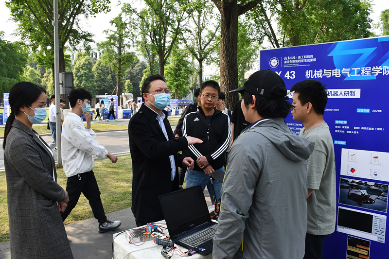 电子科技大学刘科教授介绍了学校创新创业基本情况、机构设置、创新创业教育体系、创新创业成果等内容,并带领团队成员参观了“创意信息•新工科教育” 课外创新实践学生成果展。beat365官网调研团队认真参观学习了成果展亮相的论文、课外实践创新作品、重点学科竞赛集体等,分别与信息与通信工程学院、电子科学与工程学院、机械与电气工程学院等参展团队指导教师及学生团队负责人进行了交流。参展学生热情邀请beat365官网成员体验实践成果,从作品创意来源、应用场景等方面进行了介绍。