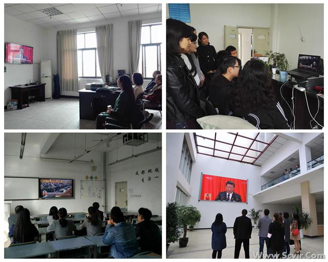 图:教职工通过电视、网络和LED屏收看大会直播,热切关注习总书记的大会报告。